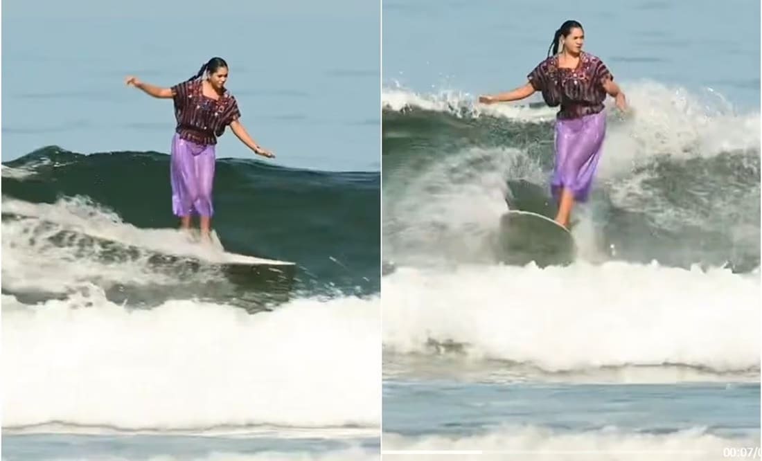 Por medio de sus redes sociales, la joven surfista dio a conocer el momento en que desafió las olas con el traje típico de Yucatán.