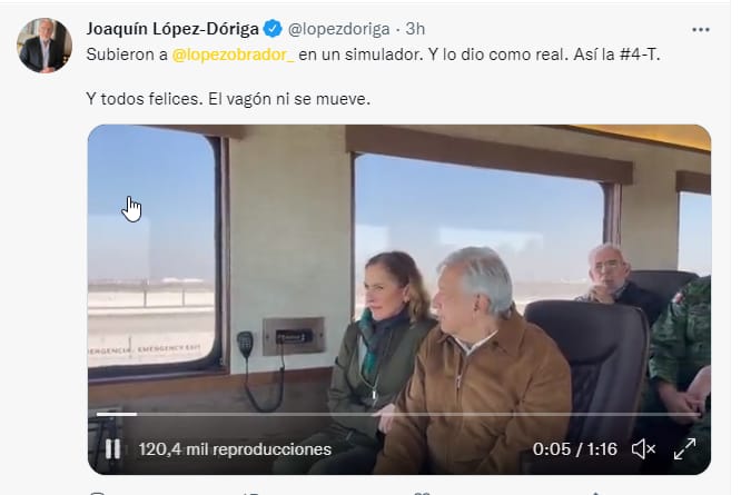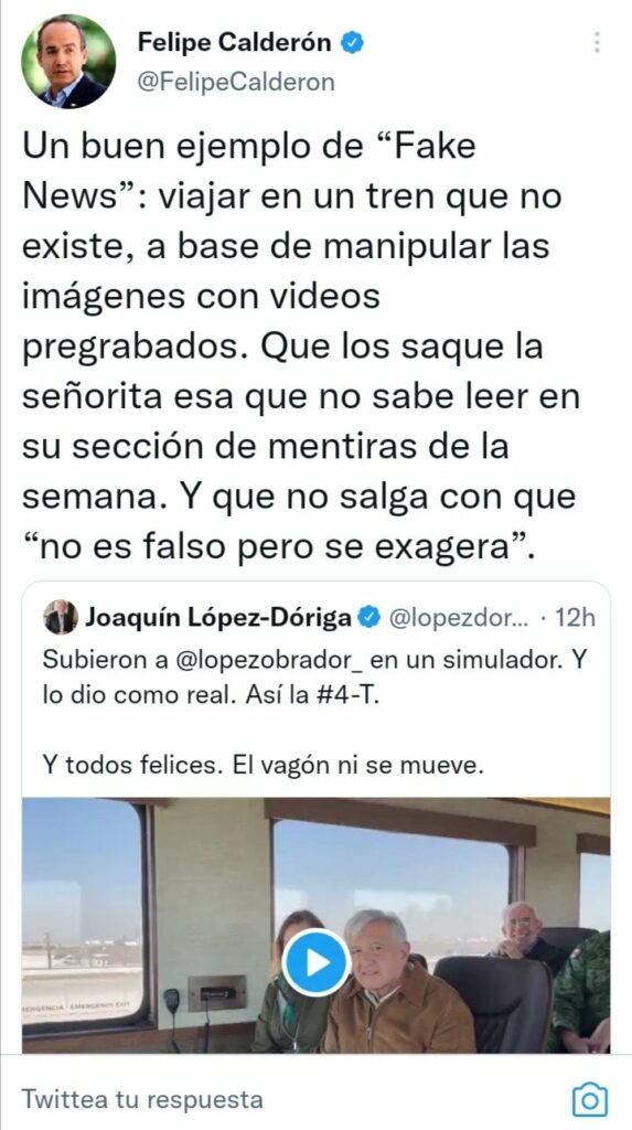 Esta vez por medio de un tuit el ex conductor de Televisa aseguró que habían subido a AMLO a un simulador que aparentaba ser un tren. Y lo dijo muy seguro, tan es así que muchas persionas, incuidos otros periodistas y opositores al gobierno, como el ex presidente Felipe Calderón, retuiteraron la información. Pero todo era falso, pues AMLO sí se subió a un tren.