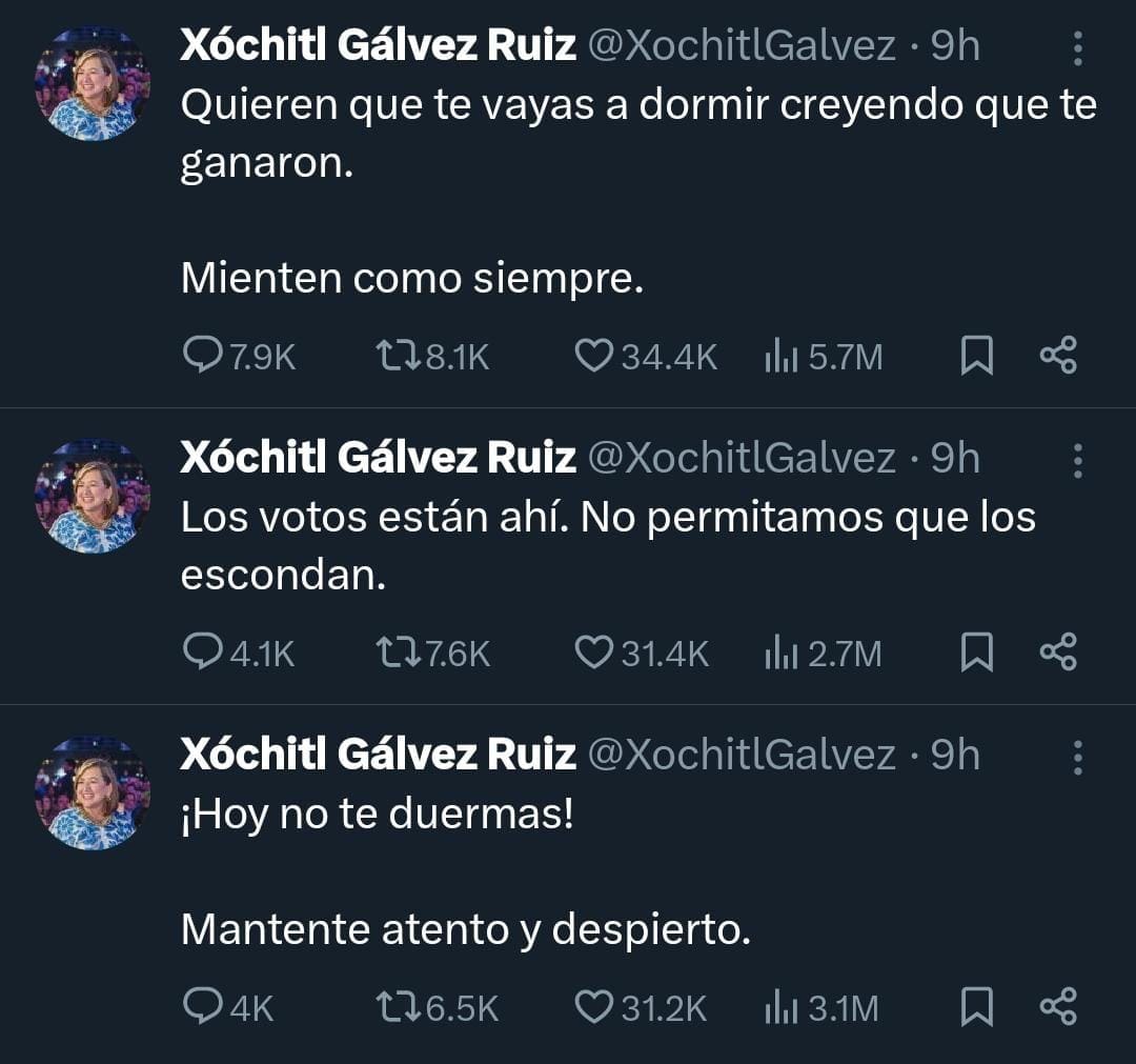 Tras concluir la jornada, y en espera de que se pronunciaran las autoridades electorales y mientras se empezaban a contar los votos, la candidata de PAN, PRI y PRD hizo algunas publicaciones en las que dio a entender que no aceptaba el resultado, que posiblemente estaban mintiendo y contando mal los votos. Y decía a sus seguidores que no había que permitir que “ocultaran sufragios”.