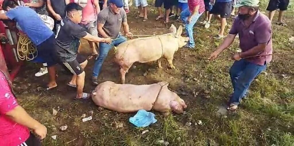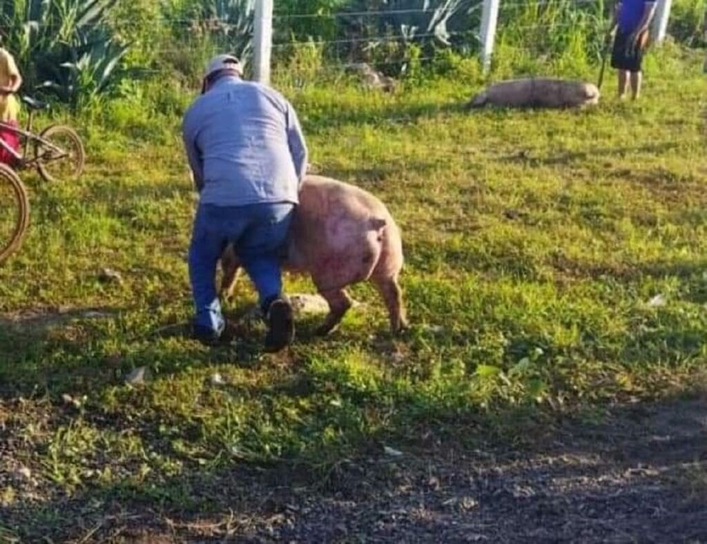 Campeche.-Cientos de personas llegaron a hacer rapiña, luego de que volcó una unidad que transportaba cerditos en la carretera Mérida-Campeche; reportan que hubo quien hasta ahí mismo los destazó.