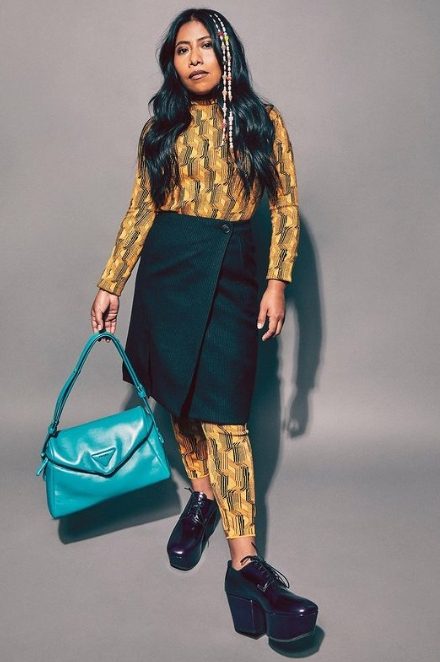 Lo que destaca del outfit que luce Yalitza Aparicio es que recuerda a los atuendos que se usaban a principios de los 2000, una tendencia que está regresando a 21 años de que en diferentes eventos las famosas lucieran un conjunto de falta con leggins, algo que mostró la actriz en su reciente foto publicada en Instagram.