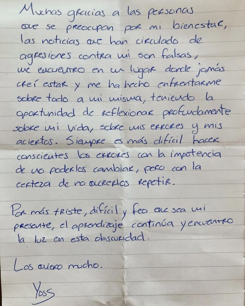 YosStop envió una nueva carta a sus seguidores para asegurar que “son falsos” los rumores de haber sido golpeada por una reclusa.