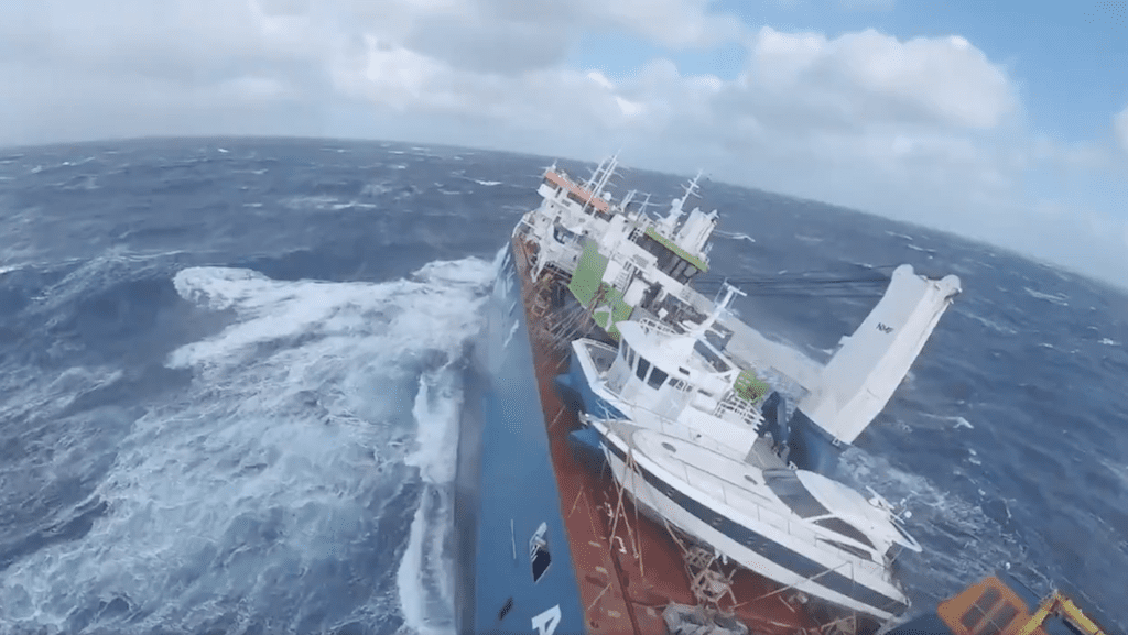 Sin embargo, las malas condiciones meteorológicas en la zona, con olas de hasta 15 metros de altura y fuertes vientos, dificultan las labores de salvamento del buque.