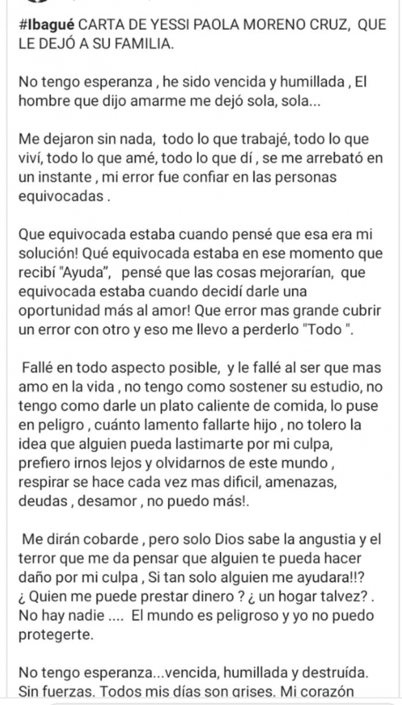 En la carta, la mujer explica que tras ingresar en los “gota a gota”, se había endeudado demasiado hasta perder su hogar.