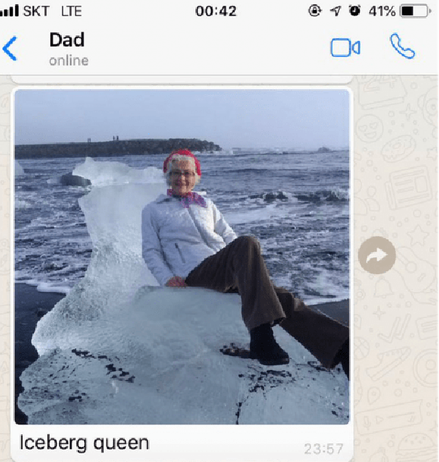 El hijo de la tierna abuelita mandó la imagen a su hija Catherine Streng por Whatsapp, titulando la foto como la “Reina del Iceberg”. Segundos después del accidente, mandó otra foto de su mamá a lo lejos señalando que “Ha perdido su reino, se ha ido a la deriva”.