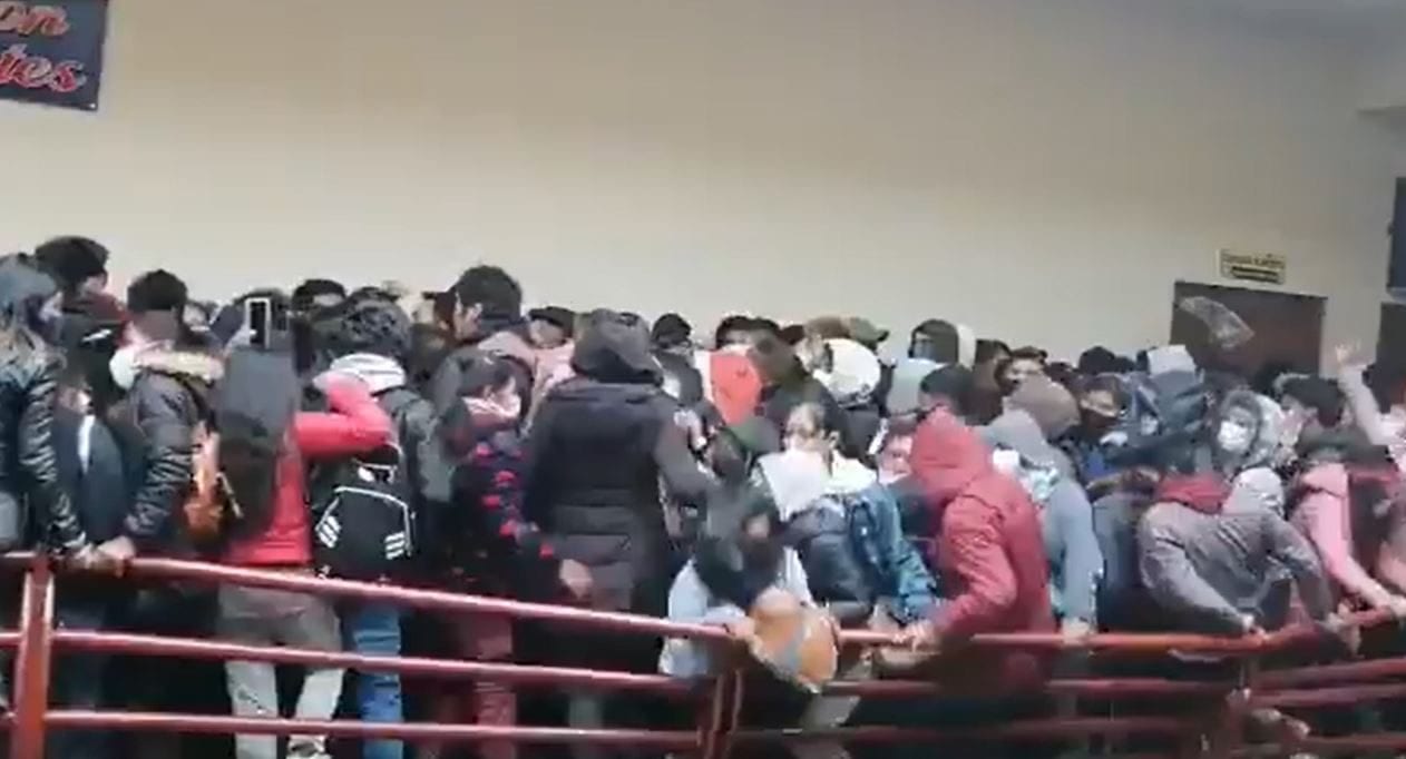 En varios videos que circulan por las redes sociales se ve a los estudiantes amontonados protestando en los corredores que dan a un salón, donde se realizaba la asamblea, momentos antes de que uno de los barandales cediera.