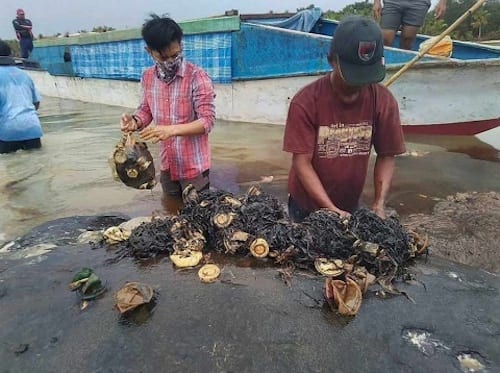Ambientalistas de Indonesia localizaron el cadáver de un cachalote, con casi 6 kilogramos de plástico en su estómago, entre vasos, botellas, bolsas y más objetos.
