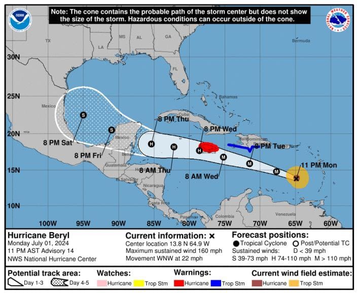 El huracán Beryl ya es un histórico fenómeno que ha alcanzado la categoría 5 con vientos sostenidos de 260 kilómetros por hora. Consideran que es un verdadero monstruo de la naturaleza por salirse de todos los pronósticos.