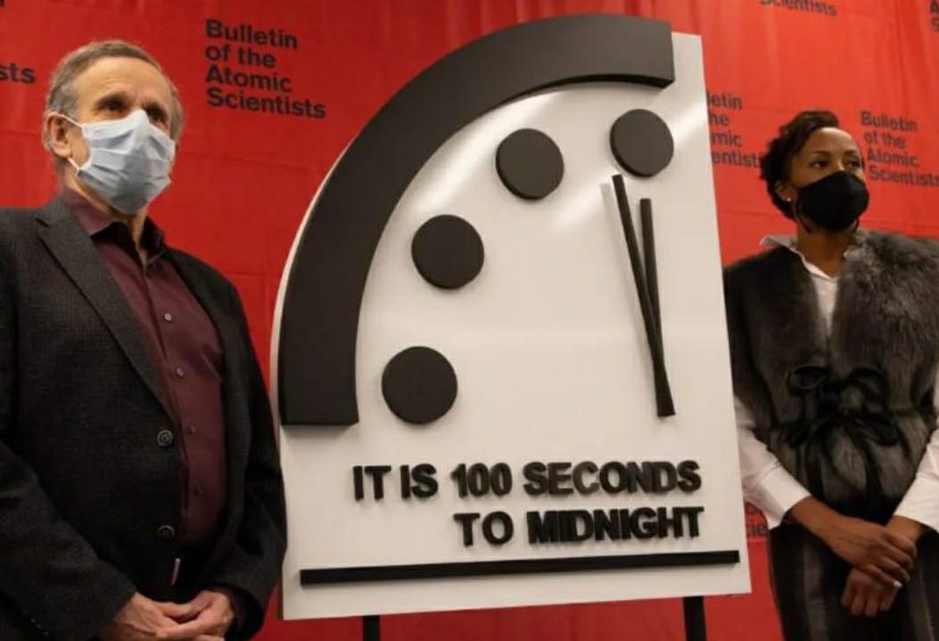 Mientras científicos subrayaron la falta de preparación de los gobiernos ante las amenazas nucleares y climáticas. El reloj del apocalipsis, que simboliza la inminencia de un cataclismo planetario, fue mantenido en la medianoche menos 100 segundos por el grupo de científicos que lo manejan.