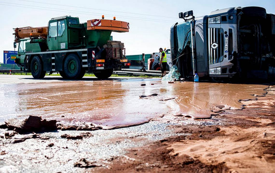 Un tractocamión se volcó en una autopista de Polonia y derramó toneladas de chocolate líquido que no tardó en convertirse en una gran masa pegajosa.