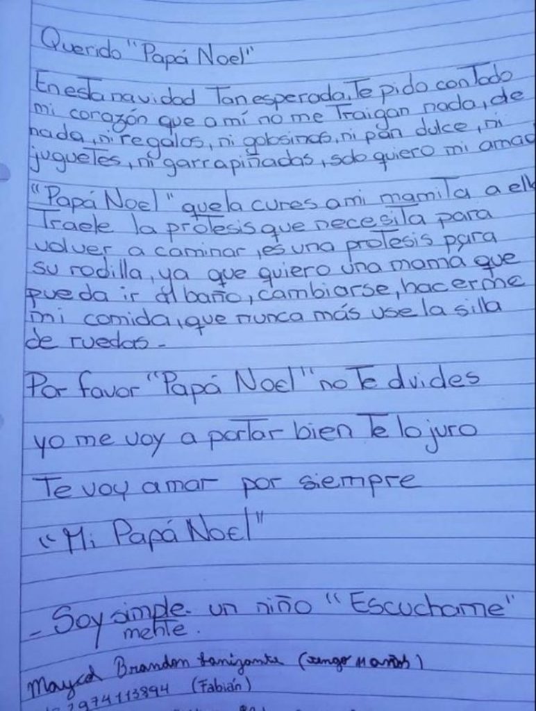 “Tráele la prótesis que necesita para volver a caminar, es una prótesis para su rodilla, ya que quiero una mamá que pueda ir al baño, cambiarse, hacerme mi comida, que nunca más use la silla de ruedas”, dijo el pequeño en su petición.