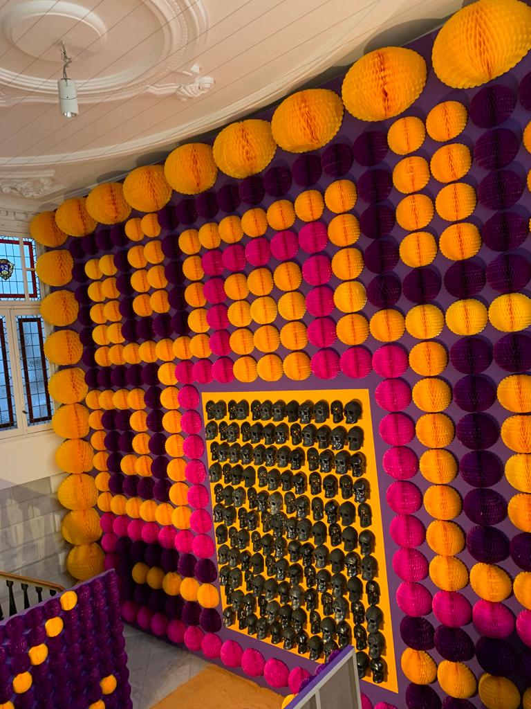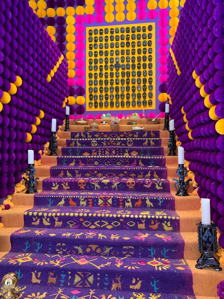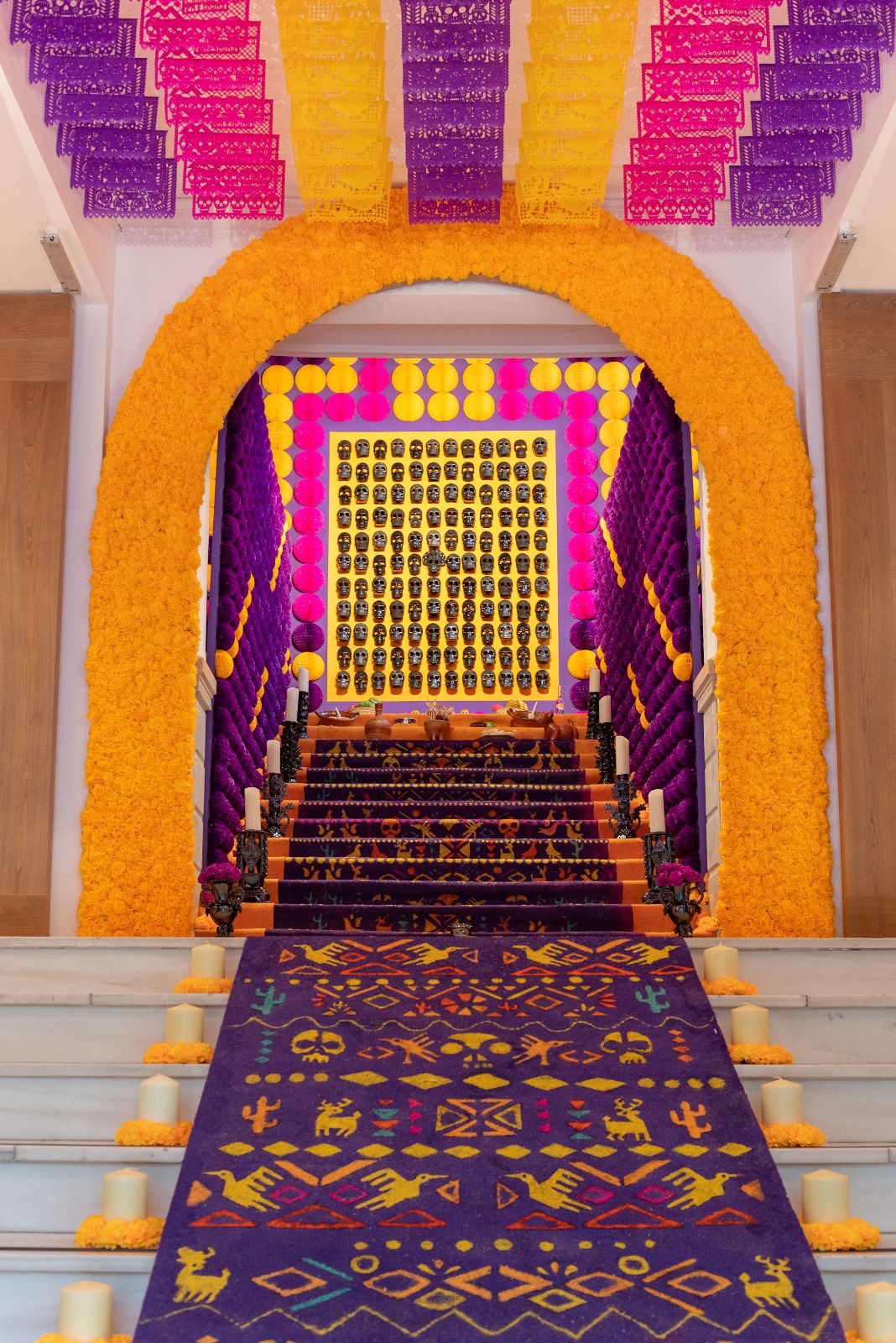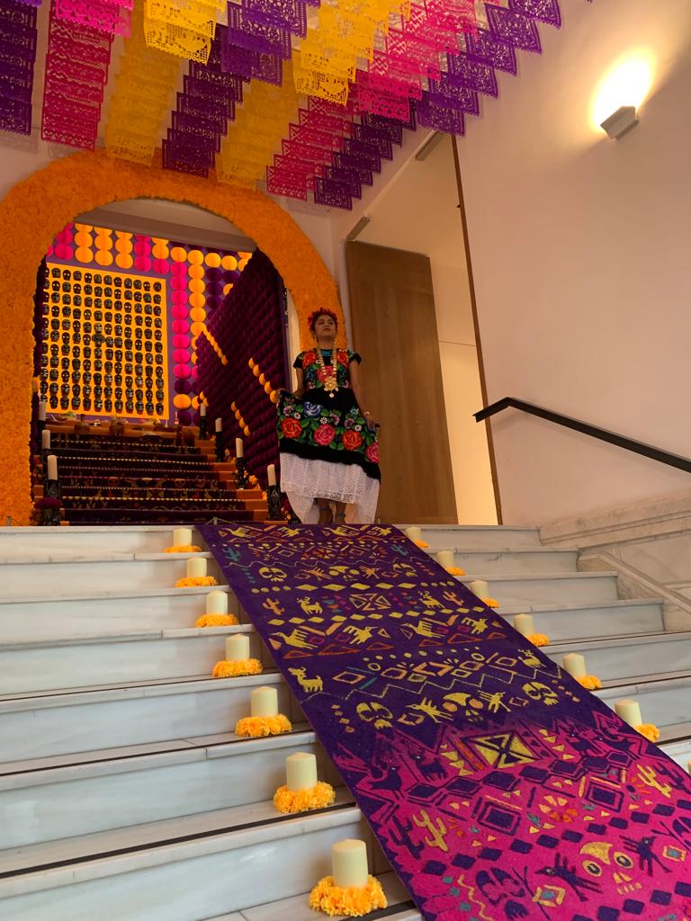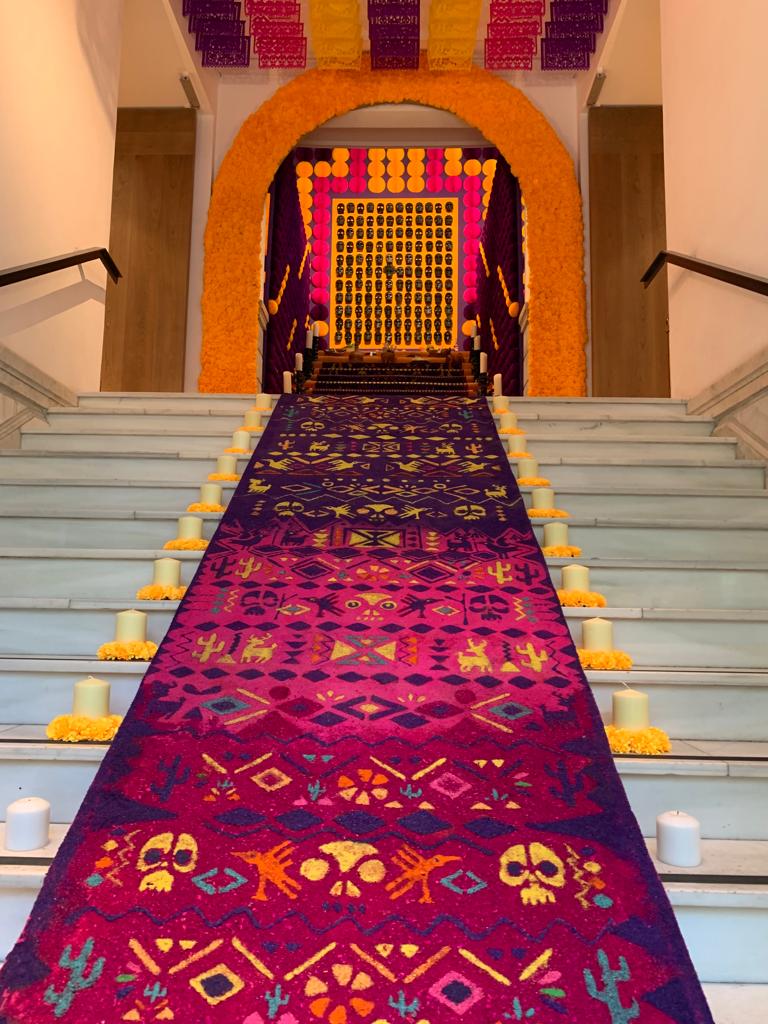 “El altar fue diseñado y conceptualizado por Fátima Cabañas,diseñadora y gestora cultural. La ofrenda fue decorada con papel picado y esferas de papel de seda, obra del taller Adornos de México, que simboliza el aliento vital el aire y la alegría de la festividad. Asimismo, se destacan cuatro intervenciones obras del arte popular mexicano”, explica.
