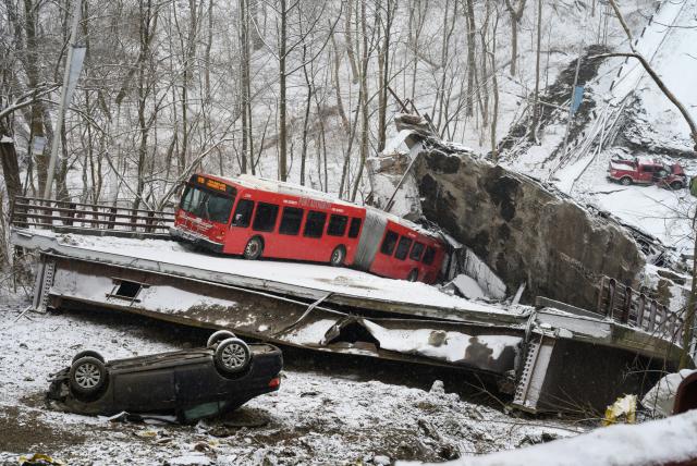 La Autoridad Portuaria de Pittsburgh informó que uno de sus autobuses articulados, de 18 metros de longitud, quedó atrapado en una losa de los restos del puente caída en la zanja.