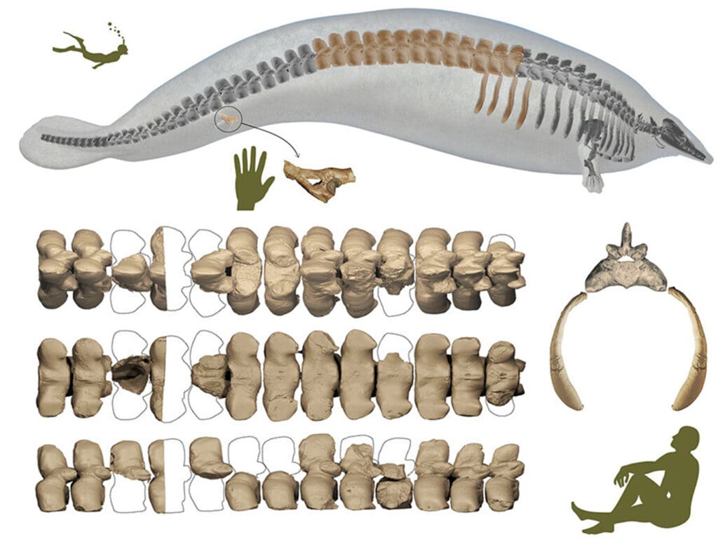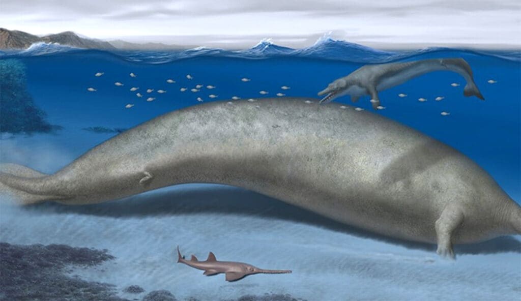 El antiguo cetáceo —cuyos huesos se descubrieron en rocas de 39 millones de años— podría haber alcanzado una longitud de 20 metros y una masa corporal asombrosa: entre un mínimo de 80 y un máximo de 340 toneladas.