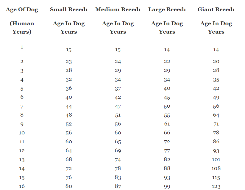 Es decir que los perros envejecen más rápido después de nacer y más despacio conforme avanza su vida; con eso cálculos y sabiendo que las razas pequeñas suelen vivir más años que razas más grandes, se puede hacer un cálculo en una tabla, que fue publicada por Sciencealert y previamente por la revista australiana Business Insider.