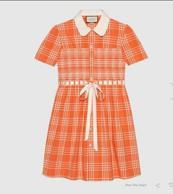 Su propuesta consta de una camisa larga de algodón a cuadros tipo escoceses de color naranja está inspirada en los looks grunge de los años 90, que además cuenta con botones de nácar y cuello Peter Pan.