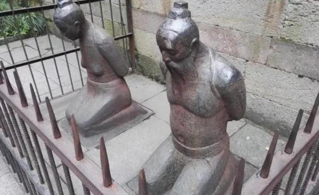 Lo que llama la atención en esta historia, es que además de esa estatua hay dos más. Estas otras representan al ministro Qin Hui y a su esposa Wang. Los dos personajes son presentados de rodillas y humillados junto a la figura del héroe, como pidiendo perdón por su traición.
