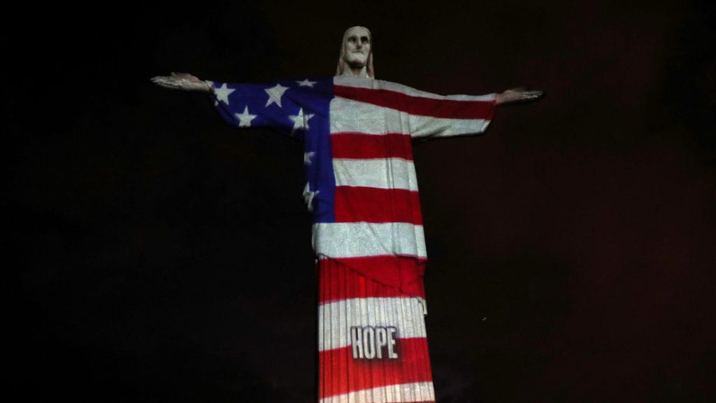 La enorme estatua de Cristo Redentor en Brasil se iluminó además con las banderas del mundo, durante un evento religioso celebrado en la cima del cerro del Corcovado a propósito del Domingo de Pascua.