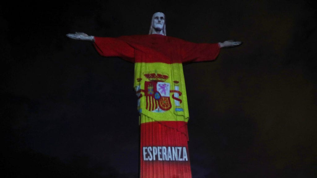 Más adelante, la estatua reflejó las banderas de varios países como España, Italia y EE.UU, las naciones más afectadas por el brote del nuevo coronavirus, seguidas de la palabra ‘esperanza’ en diferentes idiomas y también la bandera de Argentina, Brasil, Corea del Sur, Alemania y Sudáfrica, entre otras.