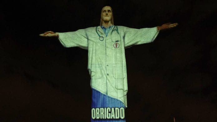 La estatua de Cristo Redentor, ubicada en Río de Janeiro, Brasil, se iluminó este domingo con el atuendo de un médico en homenaje a los trabajadores de la salud que luchan contra la pandemia.