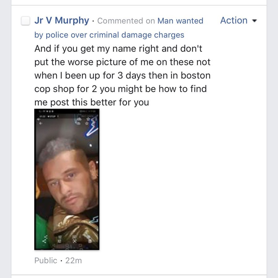 Posteriormente, a través del supuesto perfil personal de Facebook, Stephen Murphy comentó una publicación en donde pedían a la gente denunciarlo si lo reconocían y en la que cínicamente puso una foto (en un ambiente más fiestero), para asegurar que si las autoridades aún no lograban dar con él era porque nadie lo iba a reconocer con esa foto(1), por lo que les sugirió la cambiaran por esa nueva (2).