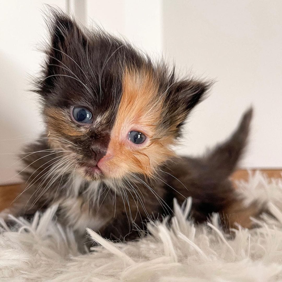 Se trata de una hermosa gatita cuyo rostro está perfectamente dividido a la mitad en dos colores, lo que podría tratarse de una quimera genética, esto es cuando dos embriones se fusionan y se producen estas condiciones.