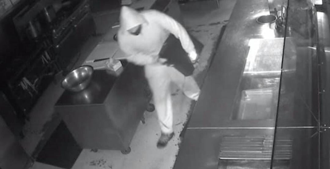 Durante el intento de robo, el criminal usaba una capucha y fue captado por las cámaras de seguridad del establecimiento. Entró en el restaurante, rompiendo la puerta de cristal en búsqueda de dinero. Sin embargo, el hombre huyó del lugar con las manos vacías, ya que el dueño del restaurante guarda todo el efectivo en una caja fuerte.