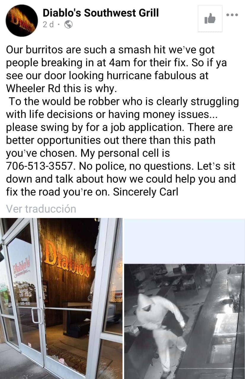 Esta es la historia de Carl Wallace, el dueño de un restaurante en la ciudad de Augusta, Georgia, Estados Unidos, quien decidió optar por una resolución pacífica después de que un ladrón irrumpió este fin de semana en su negocio.