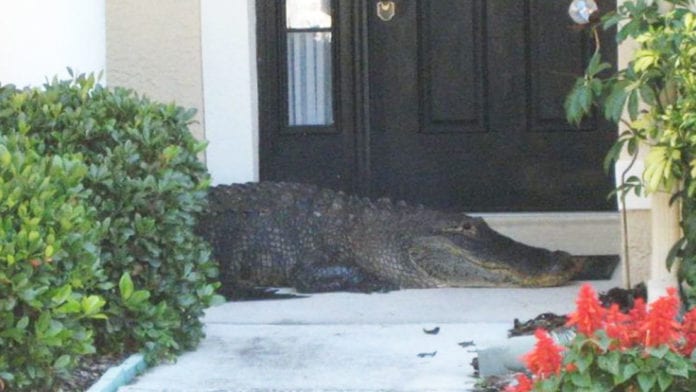 Una familia encontró un caimán de 2.6 metros de largo en la puerta de su casa y al no conseguir que el reptil se moviera del lugar, llamaron a una organización especializada.