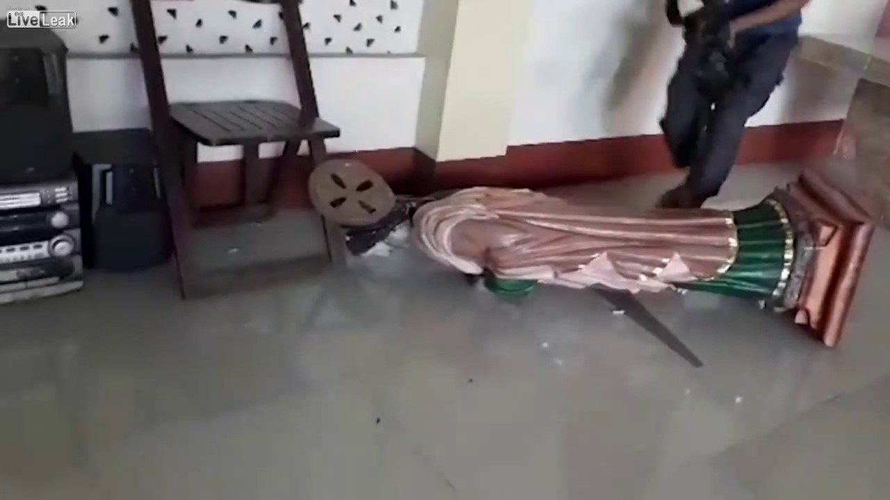 Al final le prenden fuego, y sobre el final de las imágenes capturadas, la iglesia católica se muestra cubierta de humo y completamente destruida.