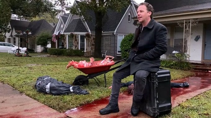 Se trata de Steven Novak, un artista de Dallas, Texas, en Estados Unidos, que utilizó varios maniquíes y 20 galones de sangre artificial para decorar su jardín con una aterradora escena de crimen que atemorizó a los vecinos y provocó que la policía lo visitara varias veces.