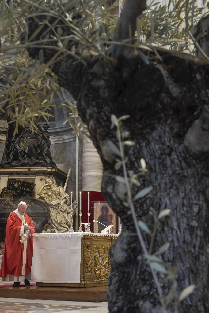 El papa Francisco ha dado inicio a los ritos de la Semana Santa con la celebración litúrgica de hoy, que ha tenido lugar en el interior de la Basílica de San Pedro y no en la plaza vaticana, como es habitual, y no ha contado con fieles por la crisis del coronavirus o Covid-19.