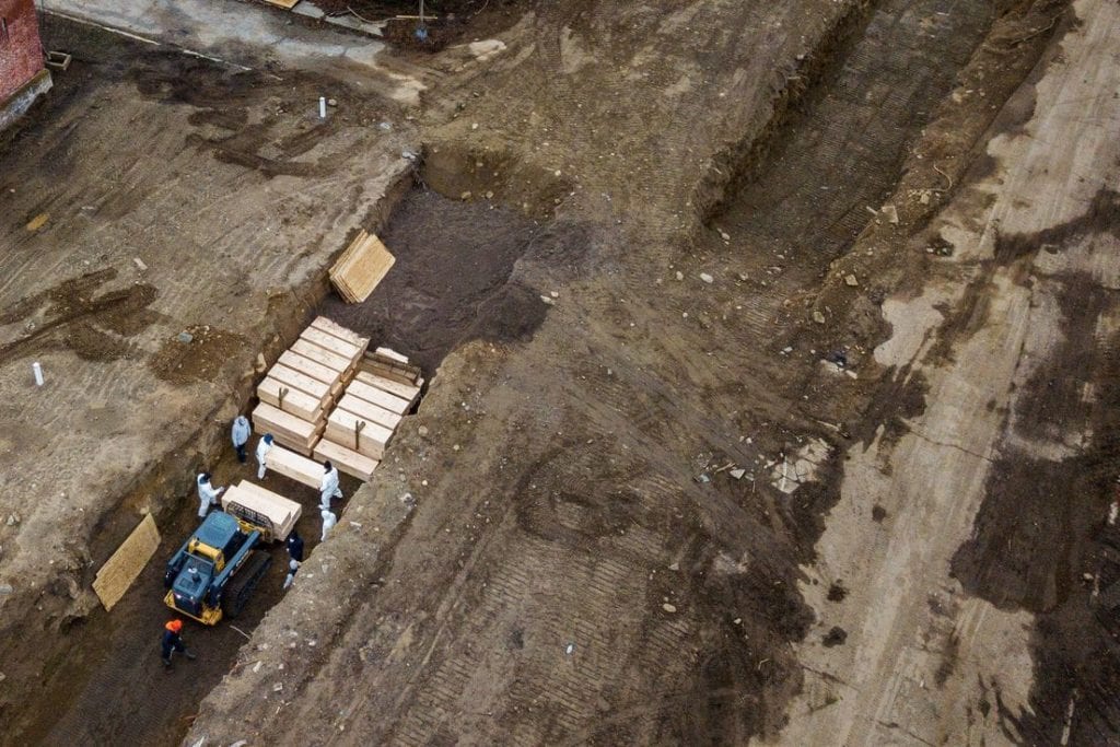Desde un dron, logran captar a varios trabajadores vestidos con equipo de protección enterrando ataúdes en una fosa común en la isla de Hart en Nueva York.