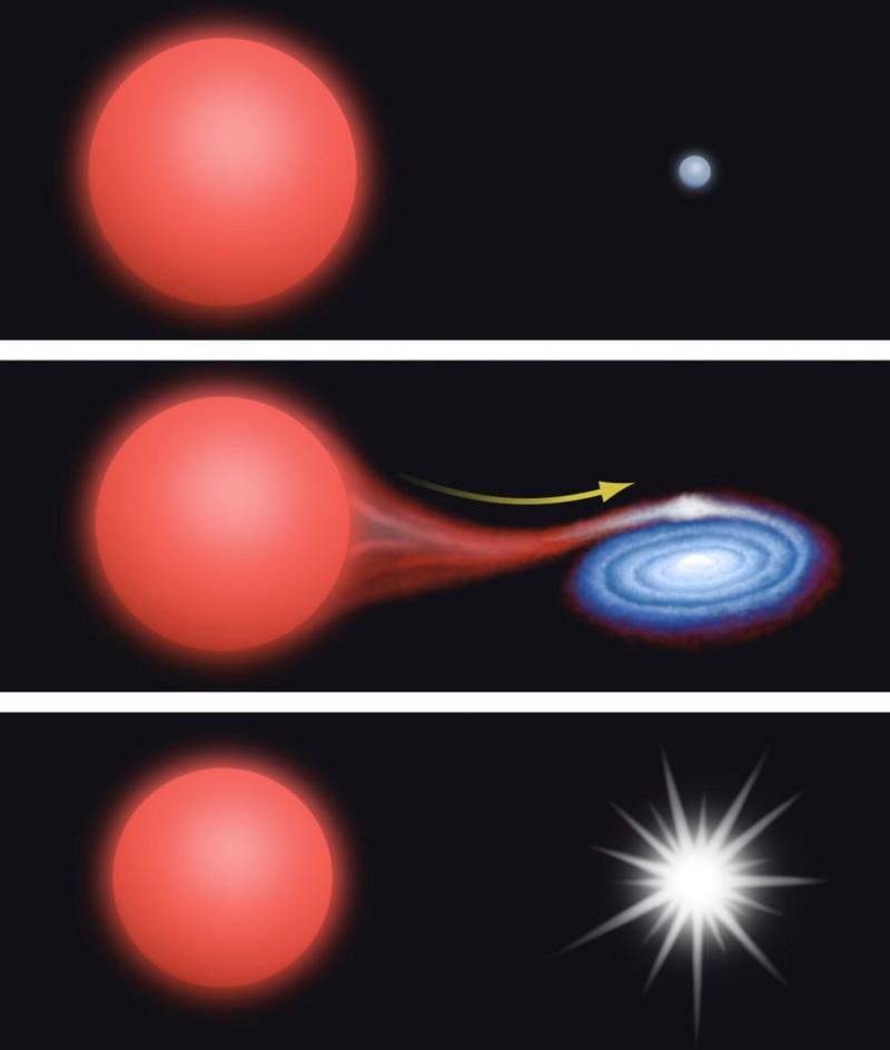 “La liberación de energía hace que la enana blanca eclipse temporalmente a su compañera gigante roja, y la emisión total de luz de ambas estrellas -cuando se ve aquí en la Tierra- se multiplica por un factor de entre 1.000 y 100.000”.