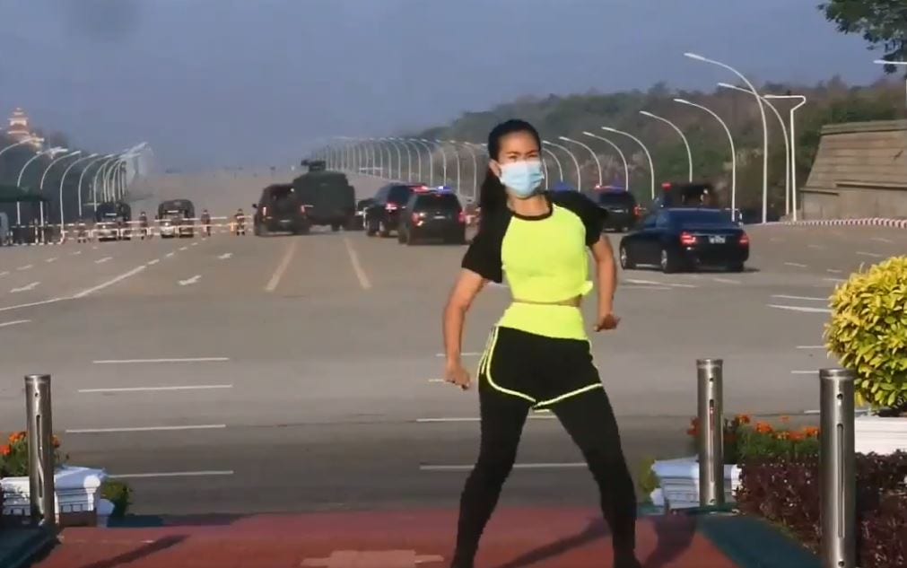 Mientras ella hacía la rutina de ejercicios al aire libre en Naipydó, capital de Myanmar, se puede ver cómo los vehículos militares se dirigen al parlamento.