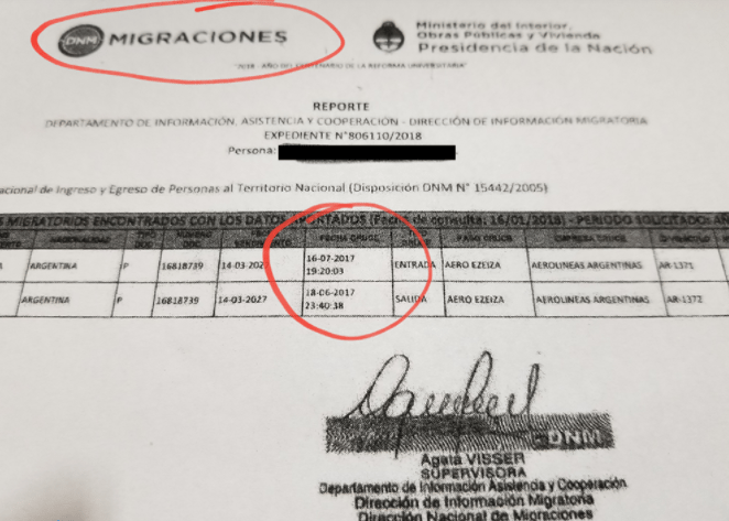 Salió del país el 18 de junio del 2017 en un vuelo de Aerolíneas Argentinas y llegó a México y regresó el 16 de julio de 2017.