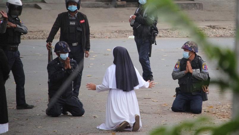 La foto del momento exacto en que una monja pide a un grupo de policías armados que la maten a ella para salvar a los niños que quedaron entre los manifestantes de las calles de Myitkyina, en Myanmar (antigua Birmania), ha dado la vuelta al mundo.