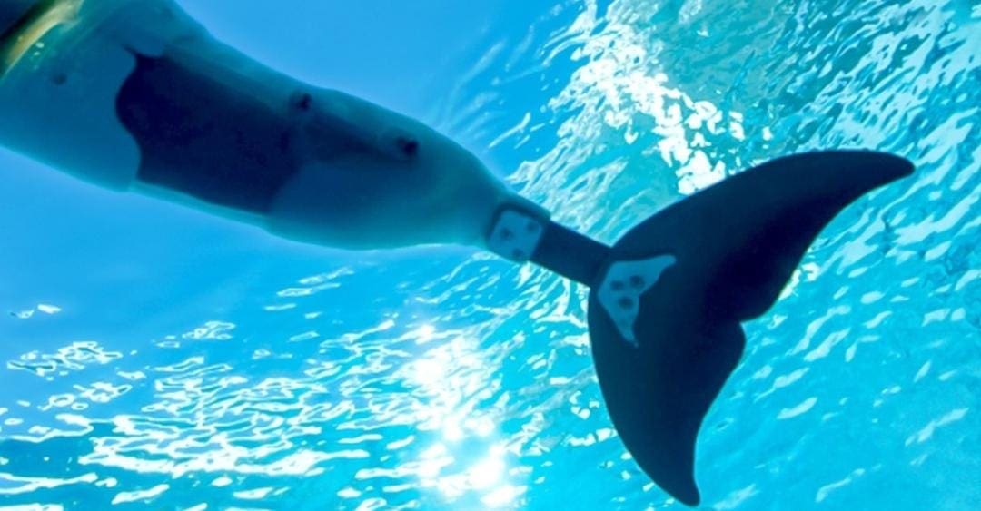 Una vez que llegó con ellos, la gente del acuario colocó a Winter, de la especie nariz de botella una cola ortopédica fabricada especialmente para ella; fue así como los entrenadores la enseñaron a nadar con esta prótesis.