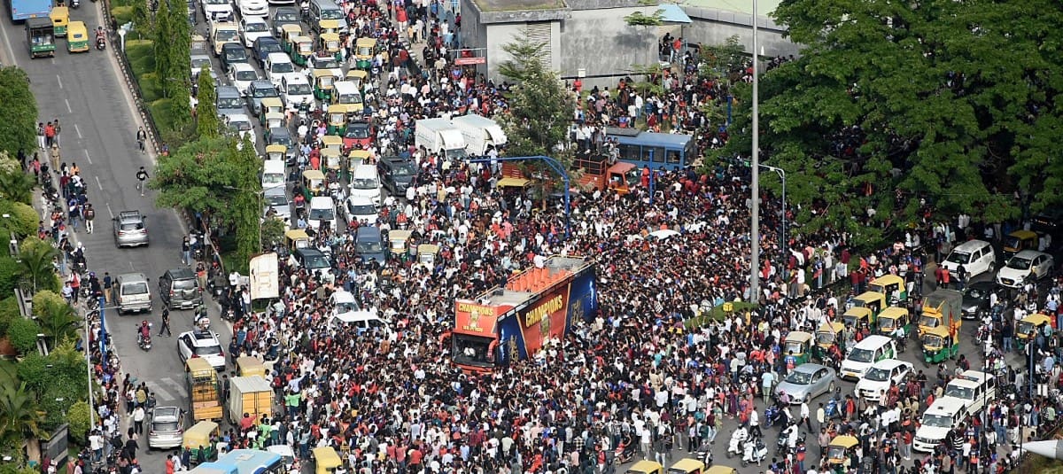 Según mostraron imágenes de las televisiones locales, algunos seguidores del RCB se subieron a las ramas de los árboles y a las azoteas de edificios, para poder seguir a los autobuses de su equipo, que llevaron a cabo una breve ruta por las calles de Bangalore.
