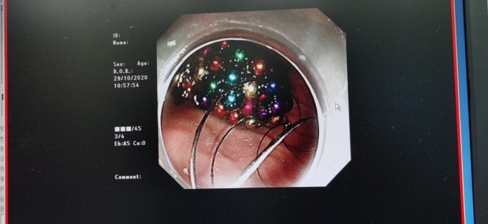 Tras pasar más de cuatro horas de cirugía donde se utilizó equipo especializado de gastroscopía, los médicos pudieron recuperar del estómago del menor las 123 cuentas de 0,5 centímetros que se había ‘degustado’.