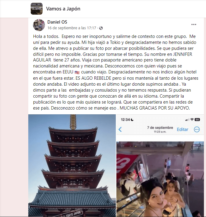 El hombre que en su perfil de Facebook está como Daniel OS y realizó la denuncia refirió que su hija se llama Jennifer Aguilar y tiene 27 años, misma que emprendió un viaje a Tokio, no han tenido contacto con ella ni conocimiento de con quién viajó y tampoco en el hotel donde se hospedó.
