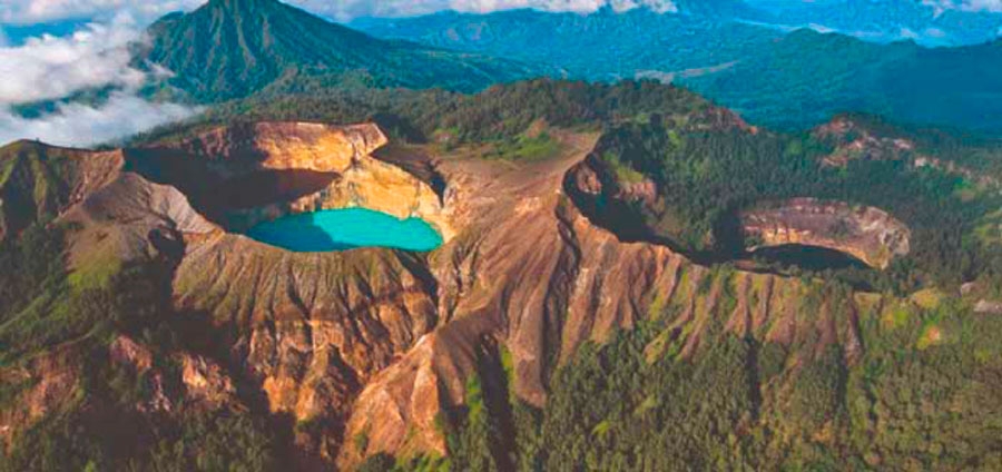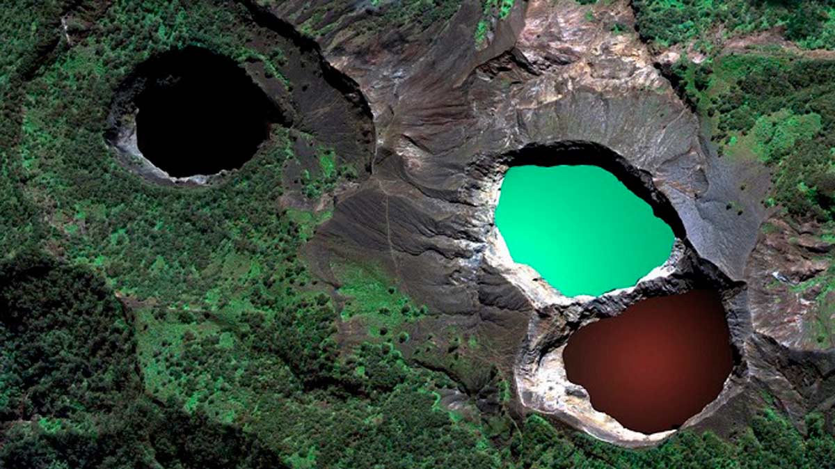 Situado en la isla de Flores, en Indonesia. Es un lugar asombroso en el que han surgido tres lagos cuya principal característica es que cambian de color. Los científicos dicen que se debe a la mezcla de vapores y de gases que emergen de su interior a altas temperaturas, causando reacciones químicas que producen cambios en la oxidación de los elementos presentes en el agua.
