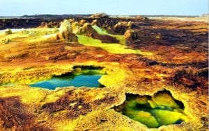 Uno de los puntos más calurosos del planeta, está situado en Etiopía. Fue un antiguo asentamiento minero que, al ser abandonado, dejó el lugar plagado de agujeros. La mezcla entre los restos de productos químicos usados en la mina y de las sustancias orgánicas expulsadas por el volcán, ha dado como resultado este singular paisaje de color amarillento.