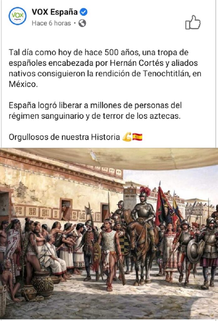 “Tal día como hoy hace 500 años, una tropa de españoles encabezada por Hernán Cortés y aliados nativos consiguieron la rendición de Tenochtitlan. España logró liberar a millones de personas del régimen sanguinario y de terror de los aztecas. Orgullosos de nuestra historia”, escribió el partido en sus redes sociales.