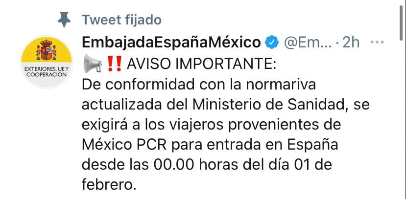 La Embajada de España en México hizo hoy el anuncio en sus redes sociales, aclarando que este examen debe realizarse 72 horas previas a la entrada del viajero a este país europeo.