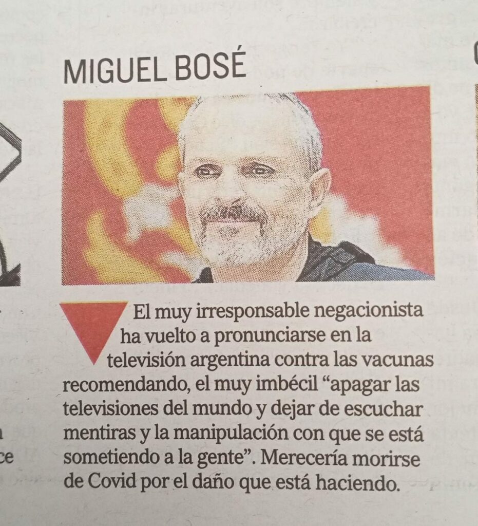 “El muy irresponsable negacionista ha vuelto a pronunciarse en la televisión argentina contra las vacunas, recomendando el muy imbécil ‘apagar las televisiones del mundo y dejar de escuchar mentiras y la manipulación con la que se está sometiendo a la gente’. Merecería morirse de Covid por el daño que está haciendo“, dice el columnista en el texto que se publicó en El Mundo contra Miguel Bosé.
