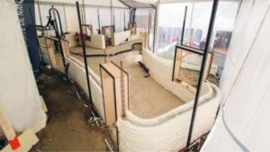 Cada pared está compuesta por dos capas de aislante de poliuretano, las cuales cuentan con un espacio entre ellas, que luego son rellenadas con cemento. Finalmente se colocan puertas ventanas y techo.