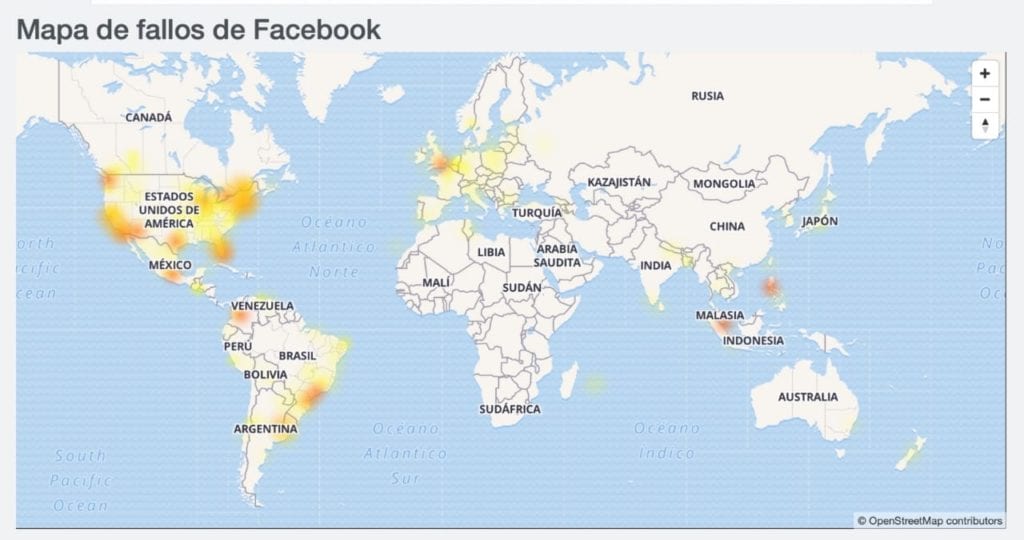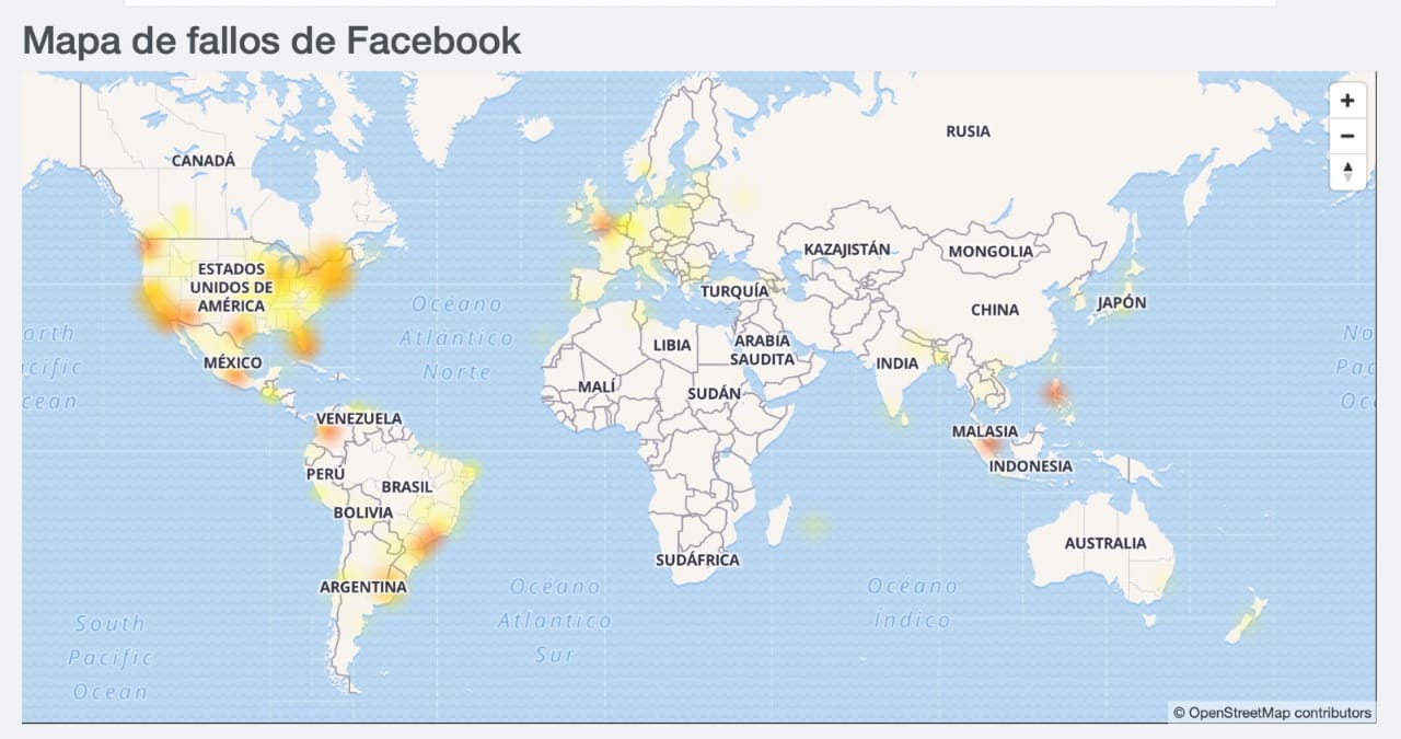 Facebook, por su parte, presentó fallas en gran parte de Estados Unidos, Colombia, Brasil, Singapur y Japón, de acuerdo al número de quejas publicadas en el portal.