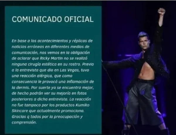Finalmente, los autores del comunicado agradecieron a los fans de Ricky Martin “por la preocupación y comprensión” al notar los cambios en su rostro.