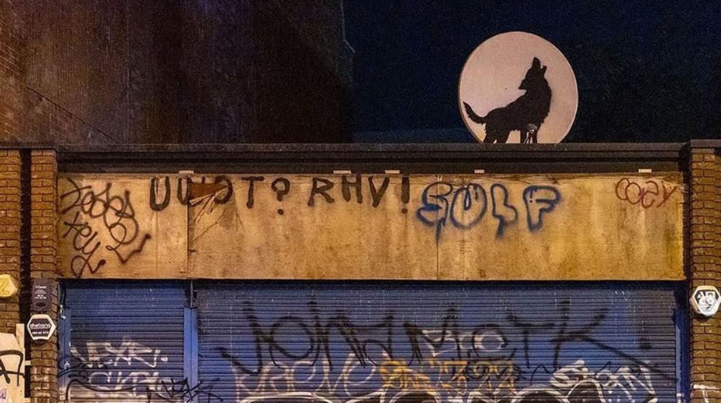 Como normalmente hace el grafitero de Bristol, en Instagram publicó una foto de su nueva creación, la que es un lobo en una antena parabólica en un techo y le da la forma de aullar a la Luna.